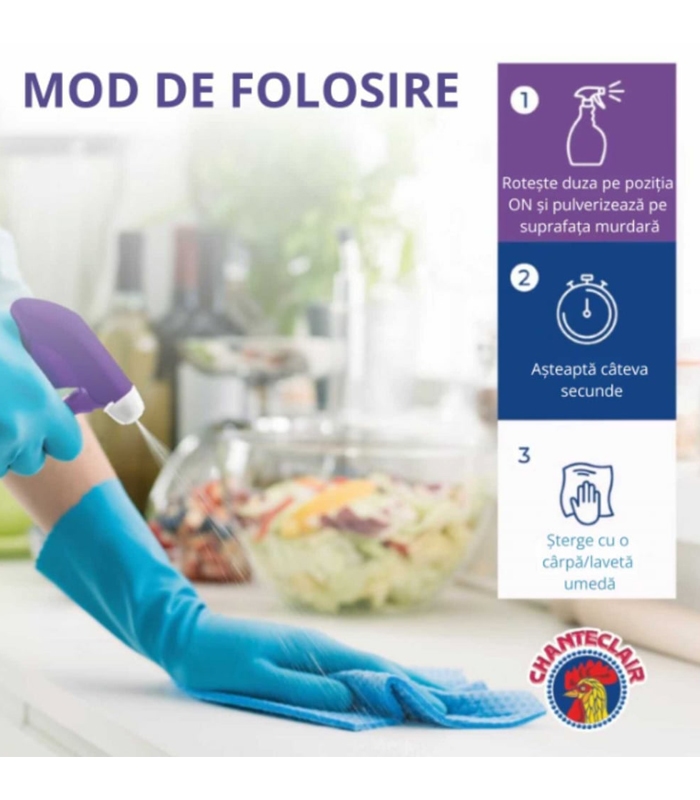 Degresantul universal Chante Clair de 600 ml care degreseaza, indeparteaza petele si curata in profunzime fara a lasa urme pe suprafetele din bucatarie, blaturi de lucru, rulouri, elemente de decor si tesaturi.