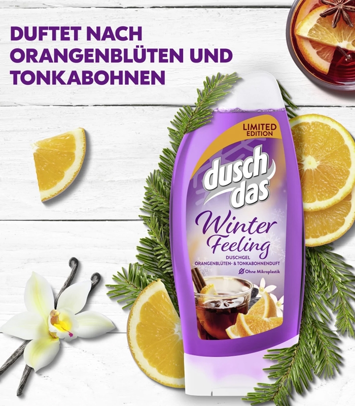 Gel de duș Duschdas Winter Feeling Ediție limitată cu parfum de floare de portocal și boabe de tonka.