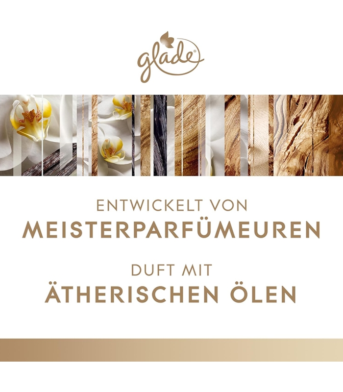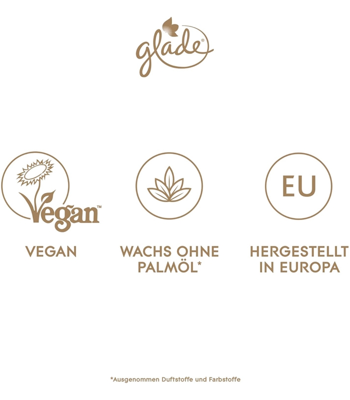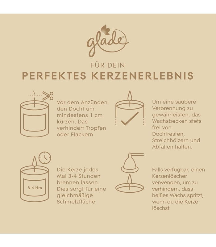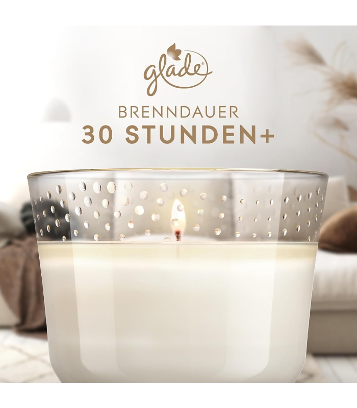 Treziți-vă simțurile și transformați orice cameră într-o oază de bine cu lumina blândă și caldă a lumânărilor parfumate Glade. Aceste lumânări parfumate compuse cu măiestrie, îmbogățite cu uleiuri esențiale naturale, creează o atmosferă primitoare în casa ta. Alegeți dintr-o varietate de compoziții de parfum exclusive care nu numai că oferă aer plăcut în cameră, ci și trezesc amintiri din momente speciale, experiențe din copilărie sau vacanțe trecute. Parfumurile au o capacitate unică de a influența emoțiile și de a crea un sentiment de satisfacție. Simțul mirosului uman este extrem de fin: cu aproximativ 20 de milioane de celule mirositoare, este capabil să distingă mii de parfumuri, adesea o singură moleculă de parfum este suficientă. Un parfum perceput este asociat automat cu experiențele anterioare, făcând amintiri să prindă viață. Lumânările parfumate Glade sunt concepute pentru utilizare în interior, dar pot fi folosite și în spații adăpostite în aer liber. Asigurați-vă că fitilul nu depășește 0,5 cm și lăsați lumânarea să ardă aproximativ trei ore pentru prima dată pentru ca ceara să se topească uniform. Folosiți din nou borcanul gol pentru lumânări, de exemplu în scopuri decorative, sau aruncați-l ecologic prin punctele de colectare de sticlă.