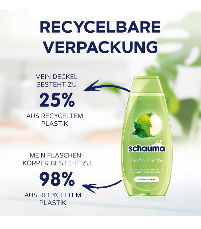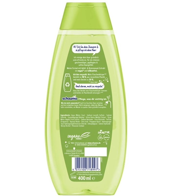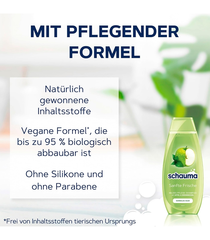Șamponul Schauma, prospețime delicată, cu extract de măr și urzică, curăță temeinic părul și îl împrospătează – pentru o senzație intensă de suplu, hrănit și moale. Formula este vegană* și fără silicon.